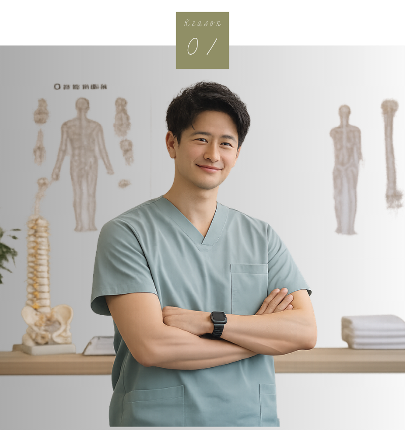 厚生労働省認可の医療系大学・専門学校にて、年間2500時間の講義を4年間受講。解剖学や運動学などの西洋医学と、大学附属病院での臨床研修を通して東洋医学も学んでおります。